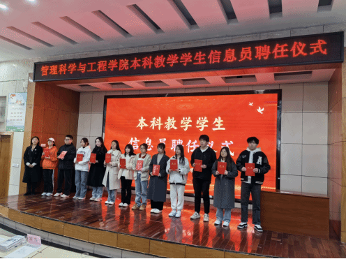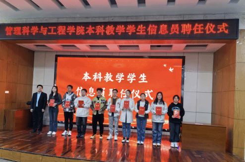 本科教学学生信息员聘任仪式在敏行301教室举行。学院党委副书记陈霞副教授、副院长荆树伟教授、辅导员老师、教师代表及28名本科教学学生信息员、各年级本科生代表参加聘任仪式。