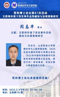 在立信楼701教室举办了第87次管科博士论坛。本次论坛主题为“互联网环境下突发事件态势感知与治理策略研究”,旨在进一步凝练学科方向和特色,加强应急管理专业建设、推动学院一级学科博士点申报工作。论坛邀请毕业于中国科学院大学的闫志华博士进行报告,论坛由副院长吉迎东主持,学院相关专业教师、研究生参加论坛。