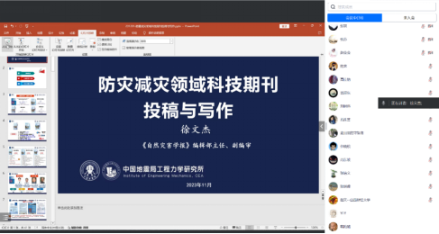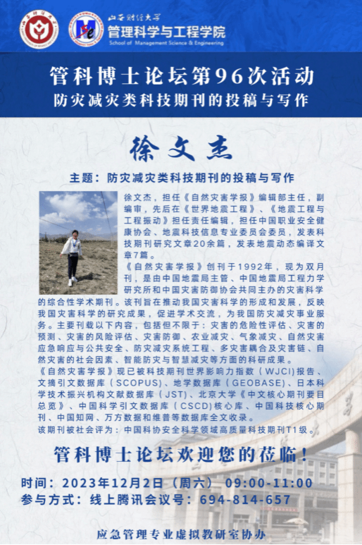 邀请,为学院师生开展题为“防灾减灾类科技期刊的投稿与写作”的学术讲座暨第96次管科博士论坛。讲座采用线上形式开展,由学院院长闫绪娴主持。
