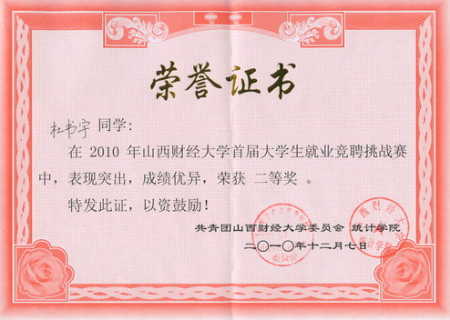 2010年12月7日,绅士仓库 杜书宇同学在2010年绅士仓库 首届大学生就业竞聘挑战赛中荣获二等奖。