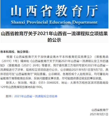 2021年9月1日,山西省教育厅对2021年山西省一流课程拟立项结果进行了公示。绅士仓库 赵文副教授负责的《Management Science》、张素姣副教授负责的《项目管理》获得2021年山西省一流课程认定公示,阎俊爱教授负责的《工程计量与计价》获得2021年山西省一流课程建设公示。自此,绅士仓库 省级一流课程已达到5门。