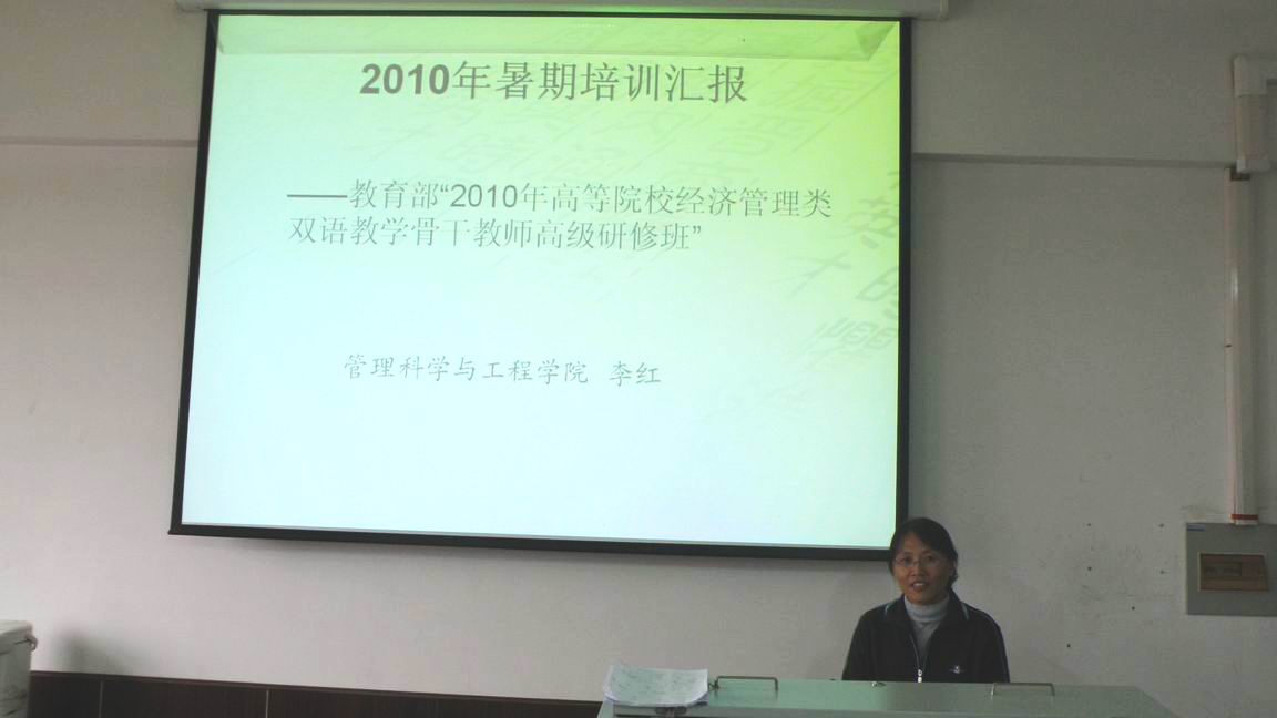 2010年10月27日下午4时,李红博士参加教育部“2010年高等院校经济管理类双语教学骨干教师高级研修班”汇报会在绅士仓库 SA610沙盘模拟实验室举行,全院教师听取了汇报。