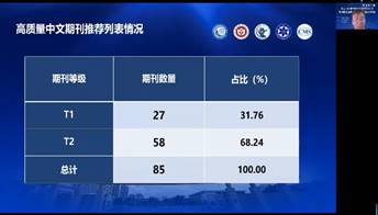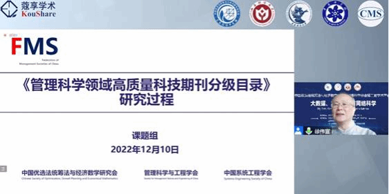 《管理科学领域高质量科技期刊分级目录》发布仪式由《中国管理科学》主编、中国科学院大学经济与管理学院常务副院长李建平教授主持。中国科学院科技战略咨询研究院徐伟宣教授介绍了《管理科学领域高质量科技期刊分级目录》的研究过程,通过视频发布《管理科学领域高质量科技期刊分级目录》,中国科学院院科技战略咨询研究院吴登生研究员介绍了FMS统计的榜单数据。