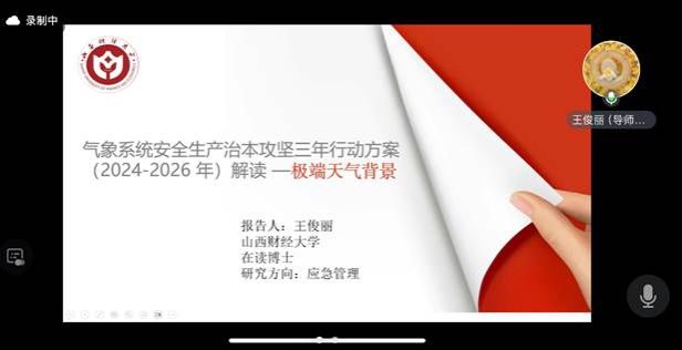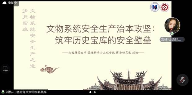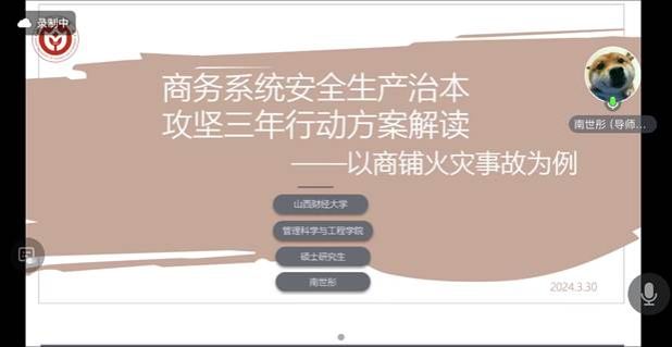 硕士研究生南世彤以《商务系统安全生产治本攻坚三年行动方案解读-以商铺火灾事故为例》为题,根据商务系统安全生产治本攻坚三年行动方案中的工作目标、主要任务和保障措施三部分进行详细解读,围绕火势控制、实施保障以及监督机制等方面对近期发生的商铺火灾事故进行了具体分析。