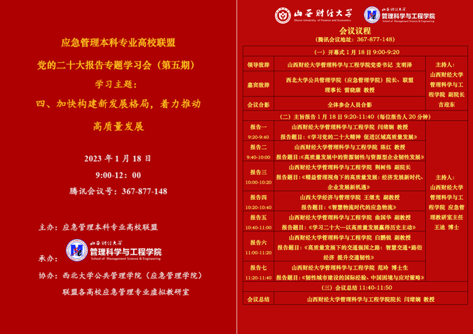 承办,西北大学公共管理学院(应急管理学院)、联盟各高校应急管理专业虚拟教研室协办的党的二十大报告专题学习会(第五期)成功召开。与会人员围绕“加快构建新发展格局,着力推动高质量发展”这一主题认真学习研讨,来自西北大学、中国地质大学、中国矿业大学、沈阳化工大学、武汉理工大学、河南理工大学、山西大学等应急管理本科专业高校联盟各个院校的师生和专家学者参加了学习会。