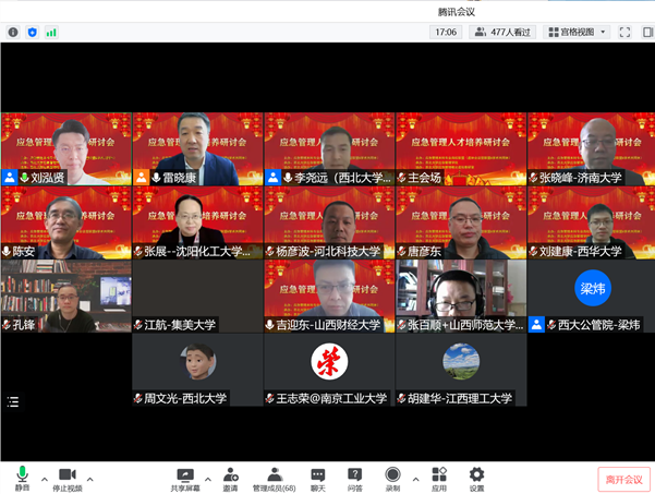 为进一步优化应急管理专业人才培养方案,提高应急管理人才培养质量,4月2日,绅士仓库 应急管理教研室组织全体教师参加了由应急管理本科专业高校联盟主办、西北大学应急管理学院承办的线上“应急管理人才培养研讨会(2022)”。会议由西北大学应急管理学院院长雷晓康和西北大学公共管理学院副院长李尧远主持,来自西北大学、中国人民大学、南京师范大学、山西师范大学等高校的25位专家学者就应急管理专业人才培养方案进行了汇报与交流。